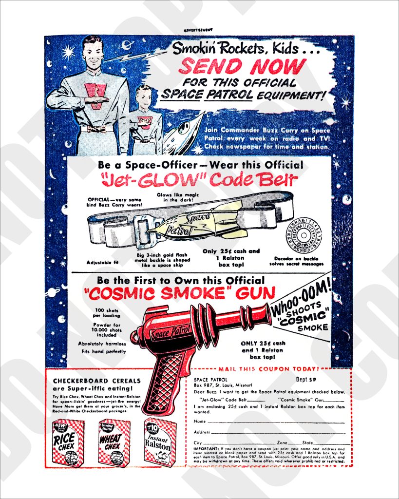 Relive the fun of the 1950s with this vibrant reproduction 8×10 photo featuring a vintage magazine advertisement for Space Patrol TV Series Code Belt & Cosmic Smoke Gun Promo Ad. A nostalgic piece of 1950s history, perfect for collectors of retro ads, memorabilia, or 50s Sci-Fi pop culture fans.